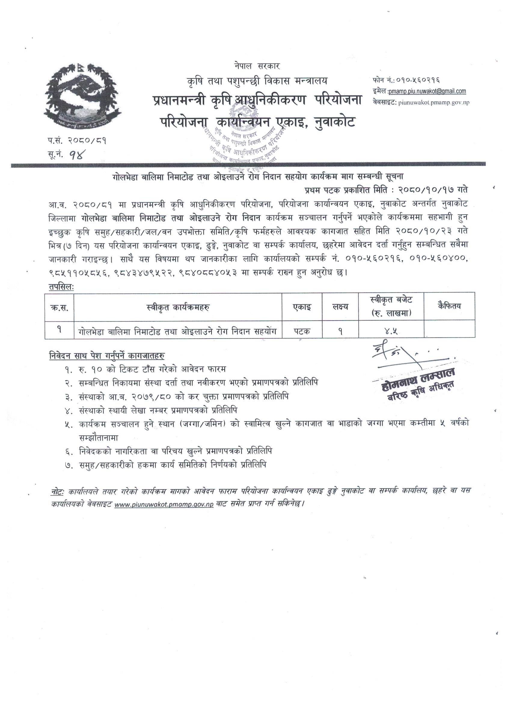 गोलभेडा बालिमा निमाटोड तथा ओइलाउने रोग निदान सहयोग कार्यक्रम माग सम्बन्धी सूचना 2080-10-17 Closed !!!