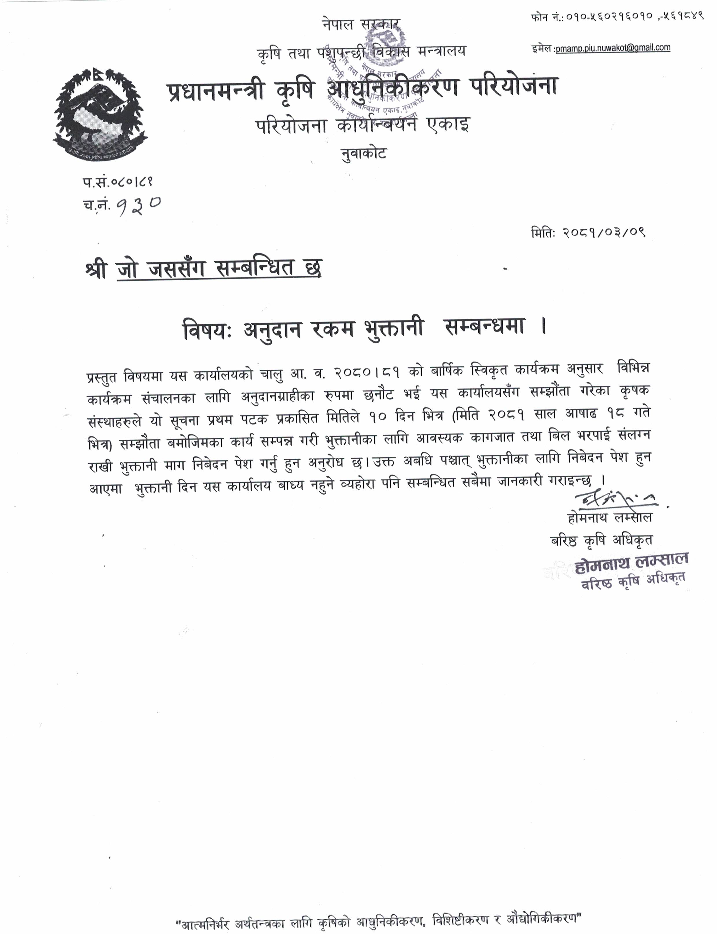अनुदान रकम भुक्तानी सम्बन्धमा 2081-03-09 Closed !!!
