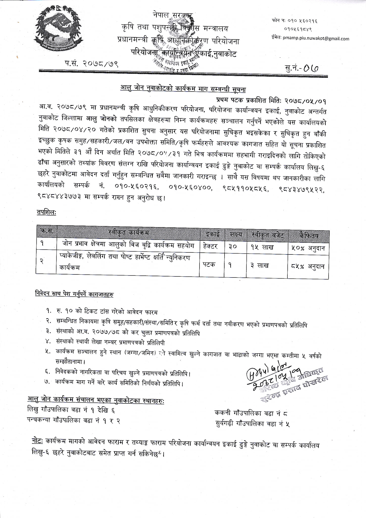 आलु जोन, नुवाकोटको कार्यक्रम माग सम्बन्धी सूचना 2078-05-01 Closed !!!