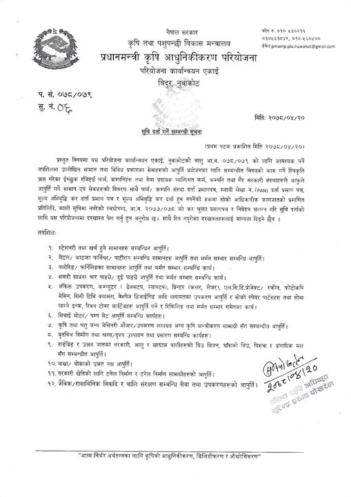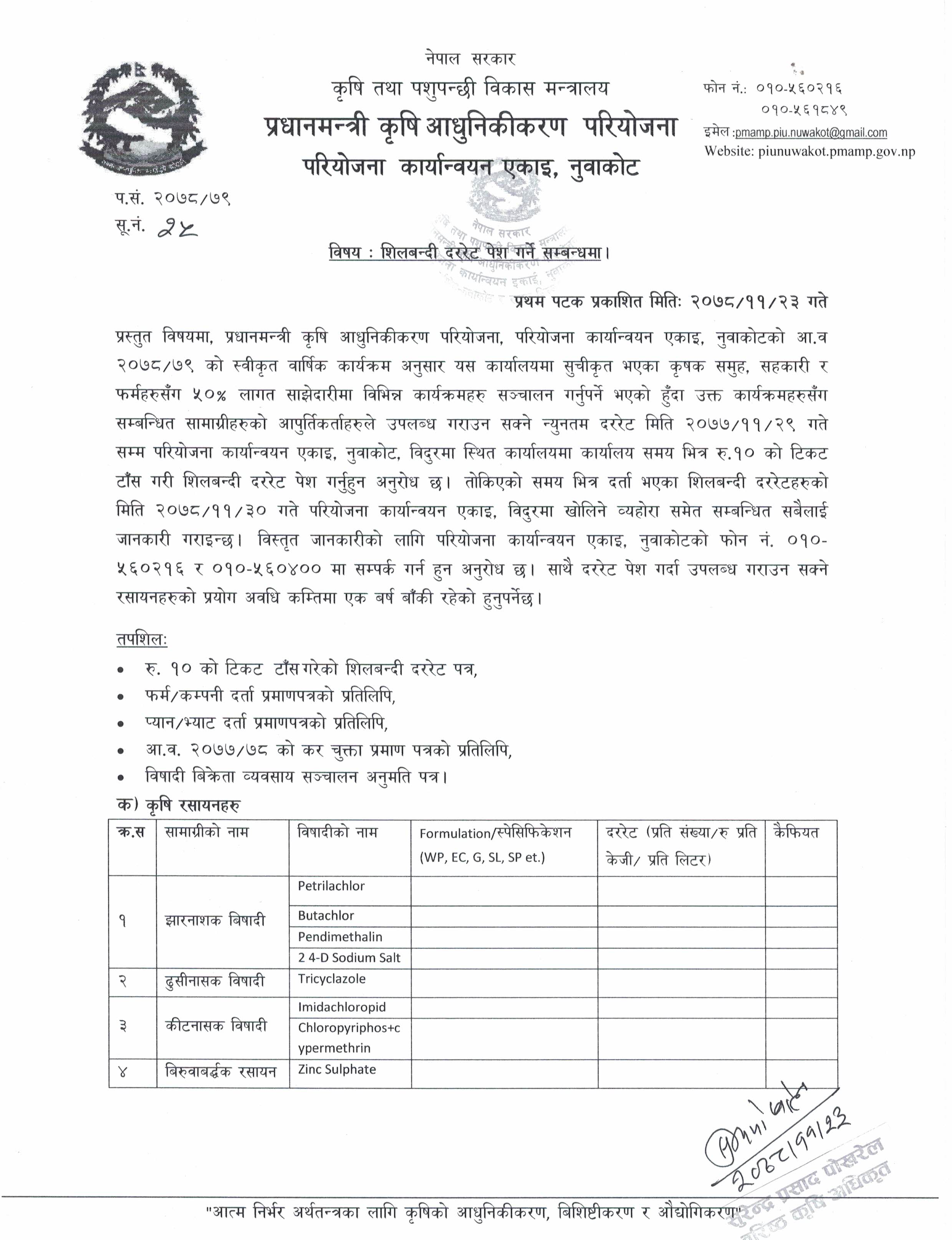 कृषि रसायनको शिलबन्दी दररेट पेश गर्ने सम्बन्धमा 2078-11-23 Closed !!!