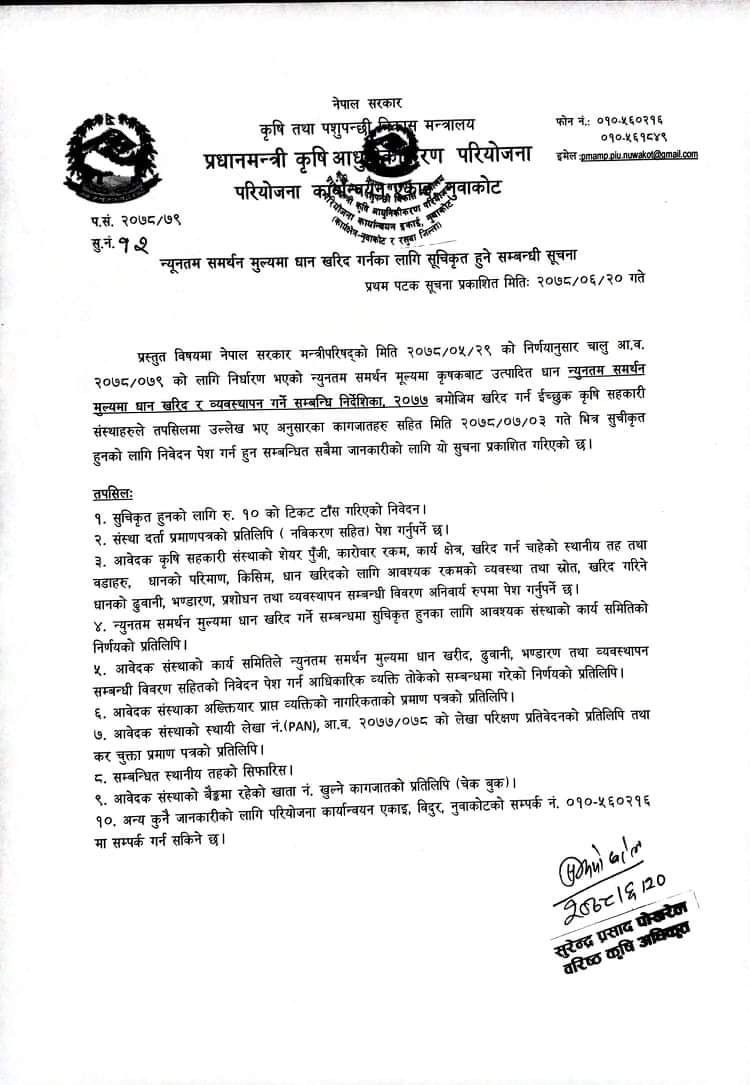 न्यूनतम समर्थन मूल्यमा धान खरिद गर्नका लागि सूचीकृत हुने सम्बन्धी सूचना 2078-06-20 Closed !!!