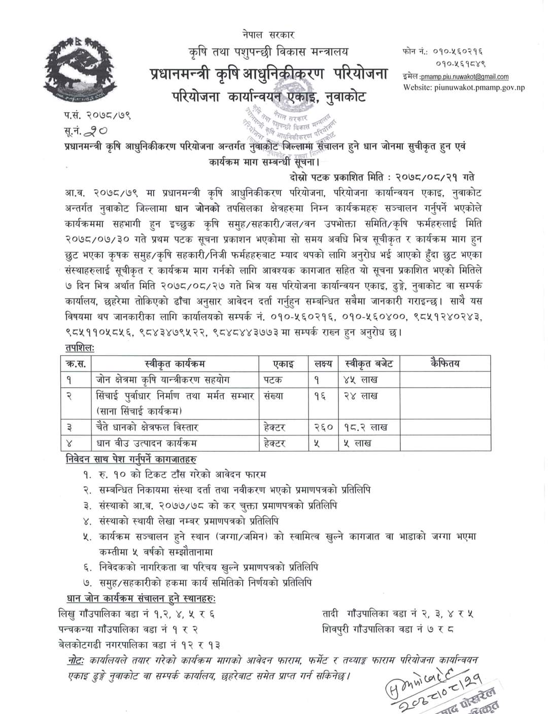 नुवाकोट जिल्लामा संचालन हुने धान जोनमा सुचीकृत हुन एवं कार्यक्रम माग सम्बन्धी सूचना 2078-07-30 Closed !!!